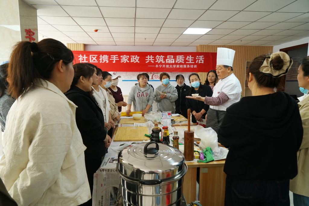 培訓當日,社區活動中心熱鬧非凡,來自不同年齡段的40余名居民踴躍參與。豐寧開放大學邀請著名廚藝大師范慶禮,憑借豐富的實踐經驗和專業知識,為學員進行面點、烹飪等技能培訓。