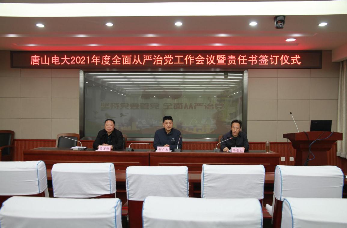4月15日下午,唐山電大在遠教樓三層學術報告廳召開2021年度全面從嚴治黨工作會議暨責任書簽訂儀式。黨委書記、校長郝廣友,黨委委員、副校長牟景文,黨委委員、紀委書記、監察專員吳萬林出席會議,部長以上干部及全體黨員參加會議。會議由黨委委員、副校長牟景文主持。