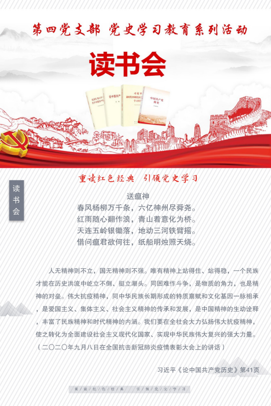 在迎接中國共產黨建黨百年之際,學習黨史是每一名黨員的“必修課”。習近平總書記在黨史學習教育動員大會上的重要講話中指出:要教育引導全黨大力發揚紅色傳統、傳承紅色基因,賡續共產黨人精神血脈,始終保持革命者的大無畏奮斗精神,鼓起邁進新征程、奮進新時代的精氣神。第四支部以重讀紅色經典為抓手,積極推進黨員閱讀紅色經典、學四史系列活動,傳承紅色基因,將黨史學習扎扎實實落到實處。